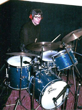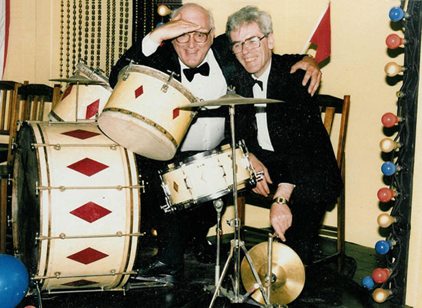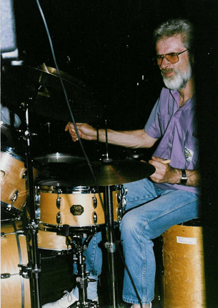 With bandleader Bob Whetstone on the set of the James Coburn movie 'Death of a Soldier', Melbourne, Australia c1986. The movie is set during World War 2, hence the amazing but unplayable antique drums!