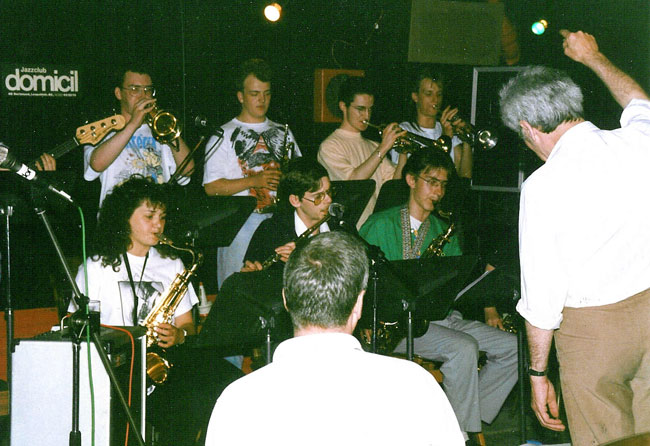 Domicil Jazz Club, Dortmund, Germany 1989, with the LCM Little Bigband, four saxes, four trumpets, rhythm. Al Wood called it the filleted bigband - no 'bones!